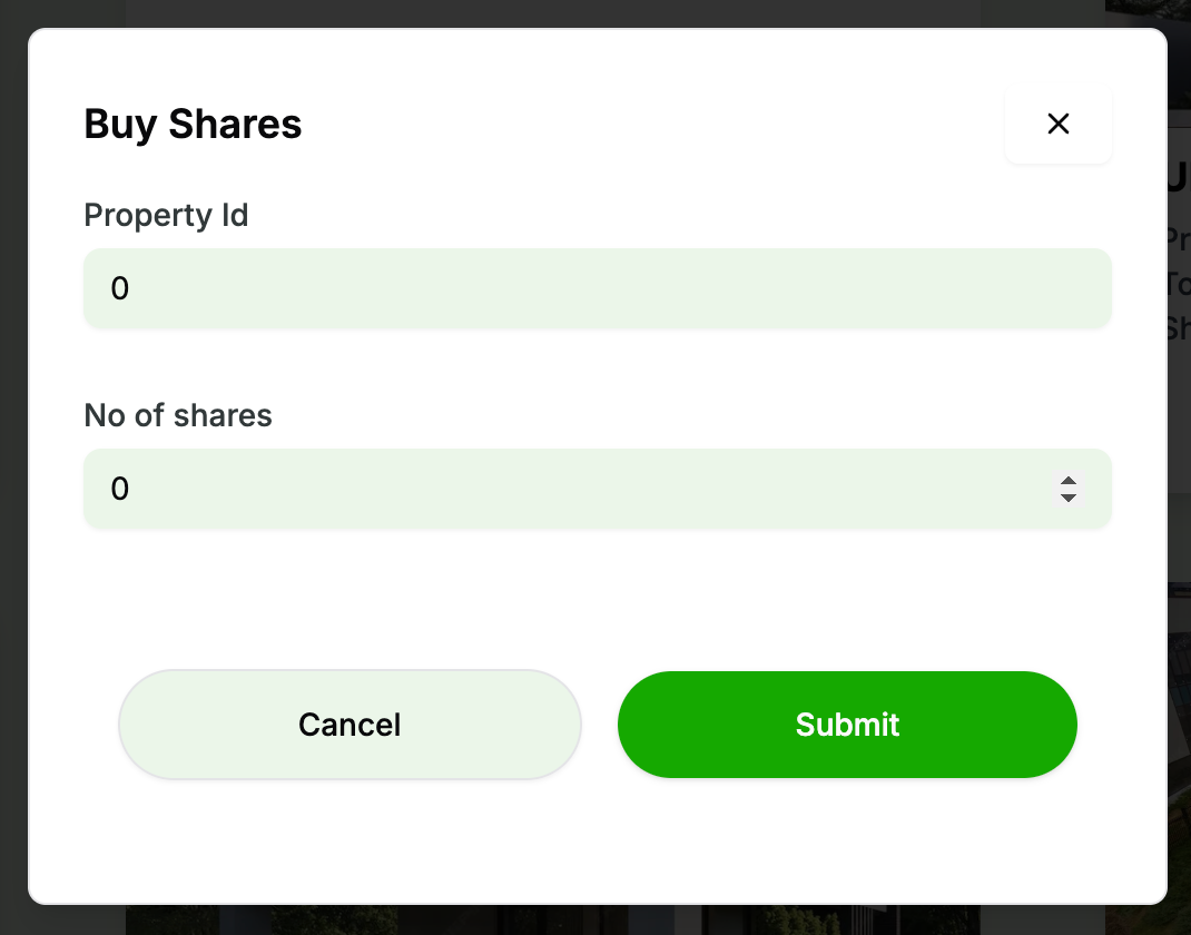 This has a similar design and functionality with the “AddPropertyModal”. This component allows users to buy fractions or shares of listed properties. The complete code for the component can be found here.