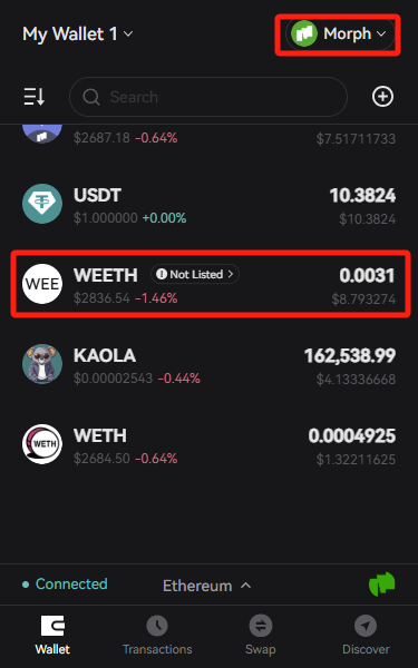 - If you open your wallet and change your network to Morph, your bridged weETH will be available.