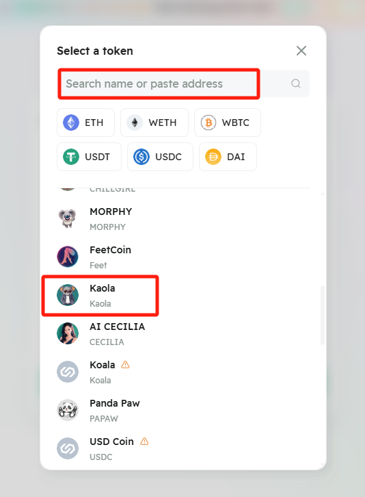 - In the Buy section below, click the Select token drop-down menu to choose the memecoin or token you wish to receive. You have the option to search with the token name or contract address, or you can select one from the list of Popular tokens below. For this example, we will proceed with a memecoin called “Koala”.