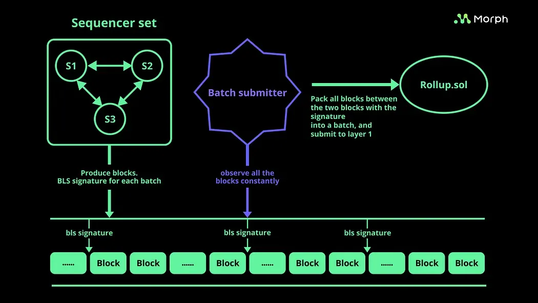 To manage the costs associated with Layer 1, sequencers sign a batch of blocks at specific checkpoints using BLS signatures. These batches are then submitted to Layer 1, where they undergo verification to ensure the integrity and consensus of transactions.