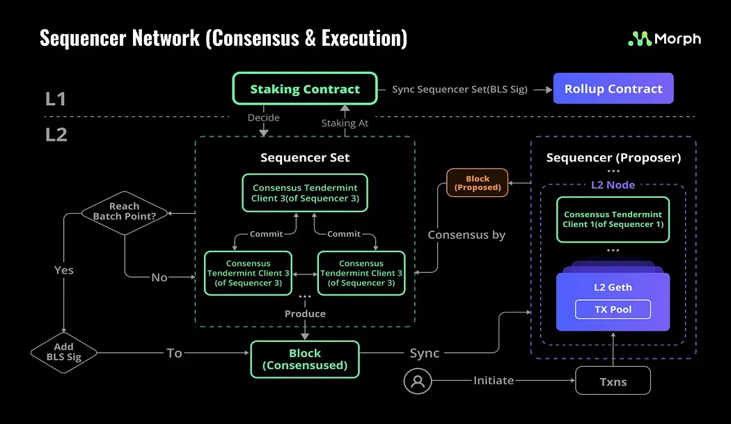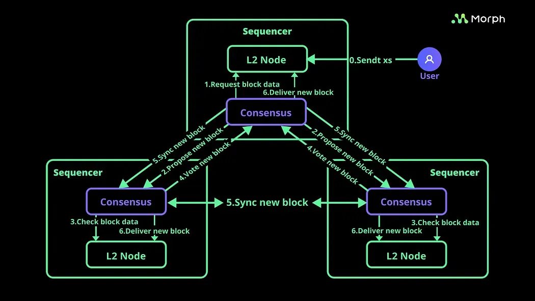 Within Morph's architecture, each sequencer operates a consensus client that communicates with other sequencers to form Layer 2 blocks. Following the consensus, transactions are extracted from the mempool, blocks are constructed, and then synchronized with other sequencers for verification.