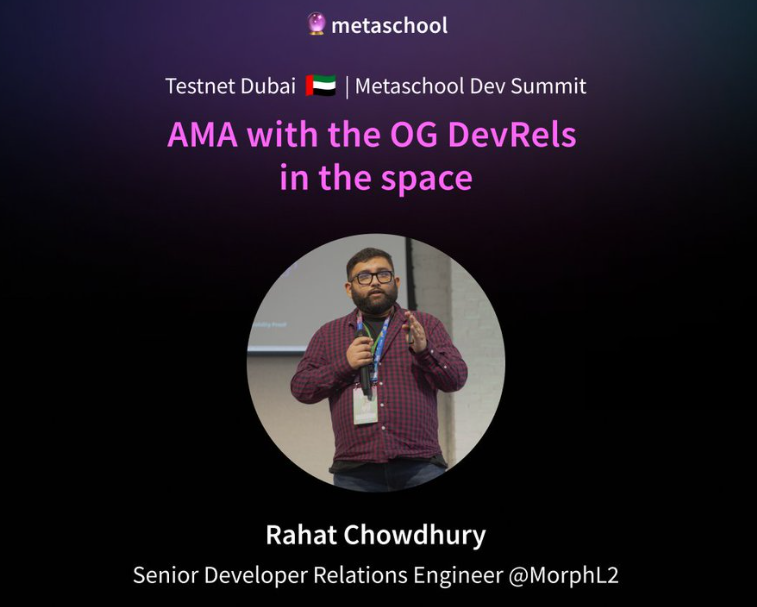 Once Rahat swam to shore from his Uber he attended the Testnet Dubai Dev Mini Summit hosted by Metaschool. This event was an immersive day of learning, networking, and community building featuring many guests from Berachain, Solana, Biconomy and more. Rahat got the chance to host the AMA with the OG DevRels in the space. Once the session concluded participants were free to socialize and network with likeminded and hardworking individuals.